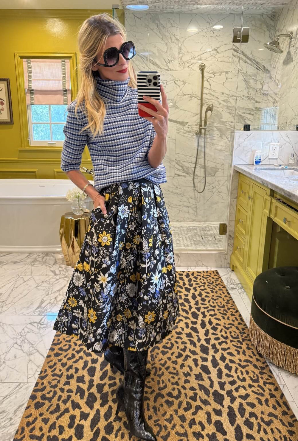 Dress down the Reed Skirt by adding our diamond print Diane Sweater and a pair of black boots.