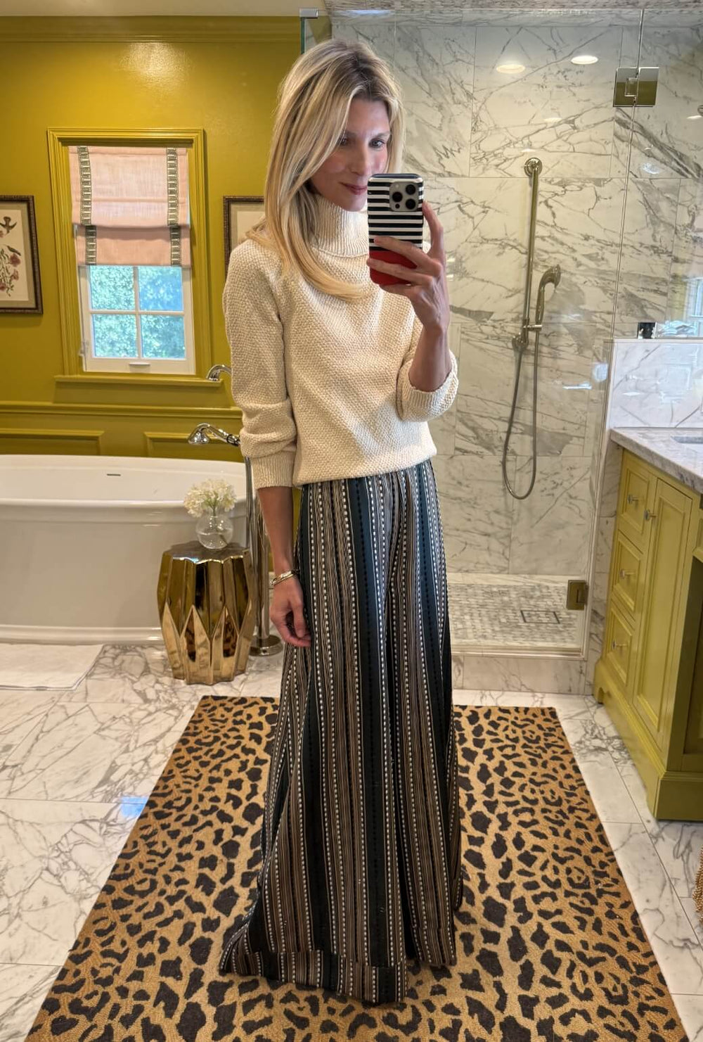 For a more relaxed look (and to get two garments out of one!), treat the jumpsuit as a statement wide-leg trouser and add a sweater on top. We love it with our ivory Carlyle Sweater.