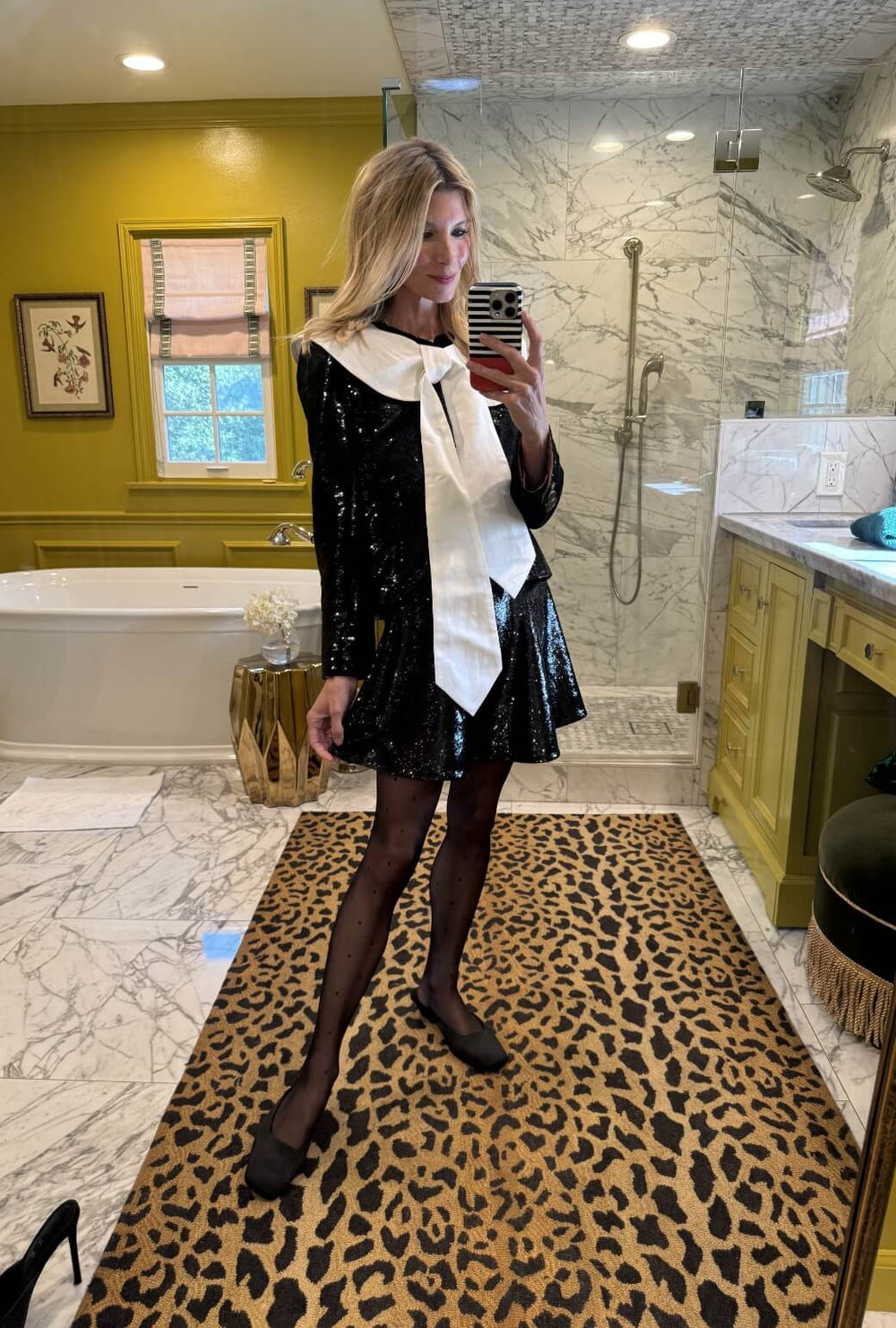 This collar is meant to make a statement, and that is what it does! Paired here with the sequin blazer and skirt from the collection, she creates a head turning ensemble for any holiday féte.