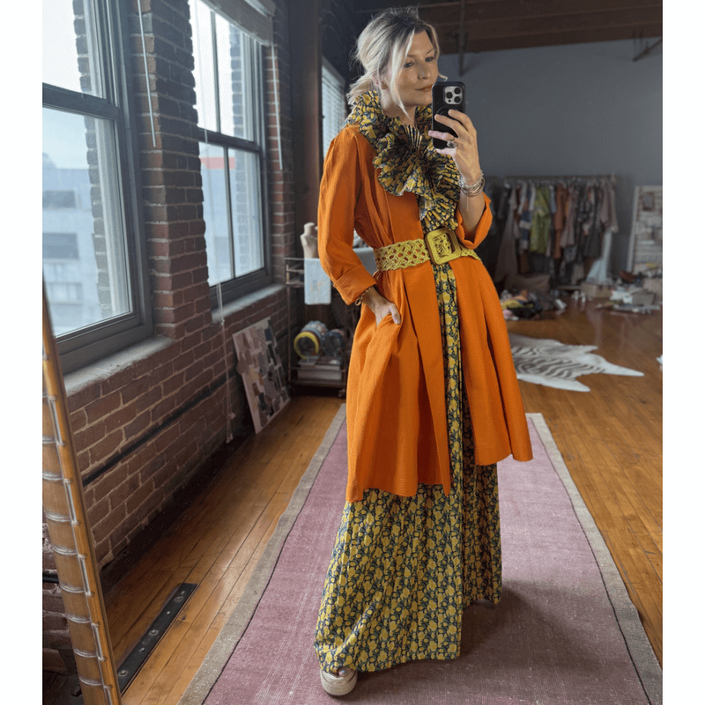 If BOLD is on your bingo card, this look will deliver. The unexpected and fun color combo, plus layering the ruffles of the dress over the neckline of the Swing Coat truly creates a statement.