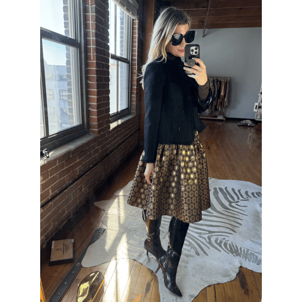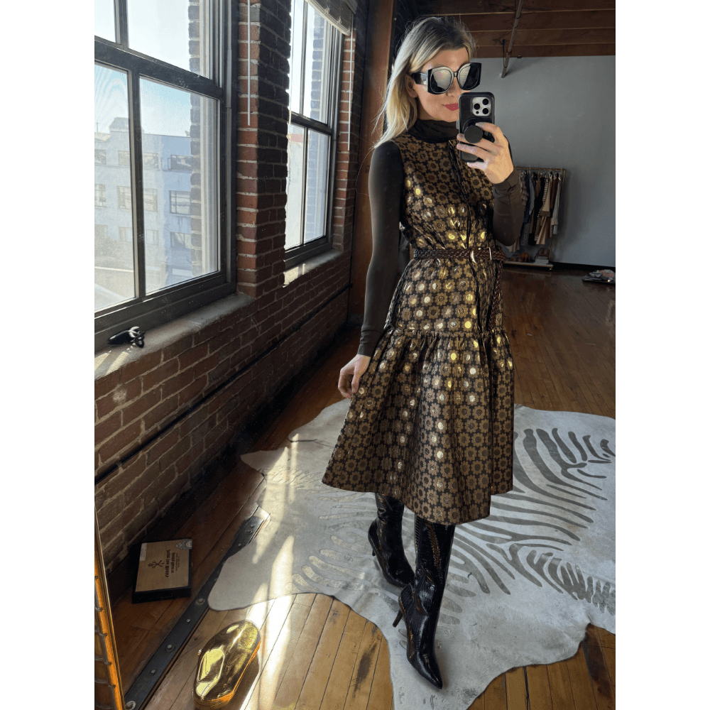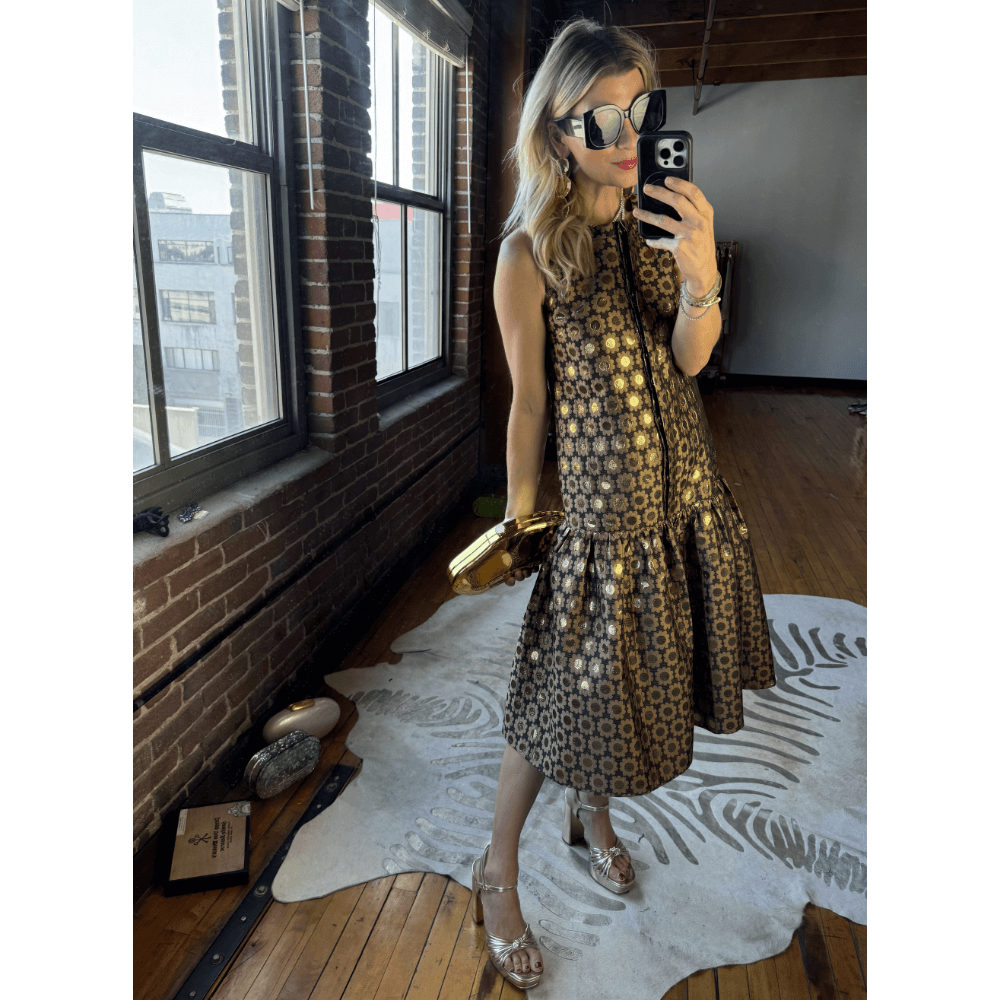 Say hello to the newest dress in the BURU Library, the Sophia Dress. Crafted from a whimsical floral brocade with gold metallic accents, this dress is an easy blend of fun and sophistication. With a drop waist, straighter fit through the bodice, hidden buttons and a flirty bottom, she's a great choice for your next party look. You can also mix it up and style with our long sleeve caramel turtleneck underneath for a more dressed down look.