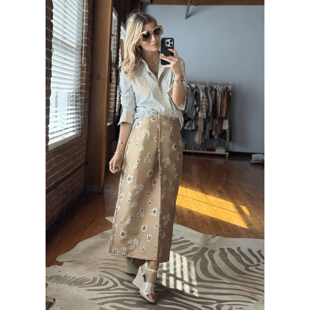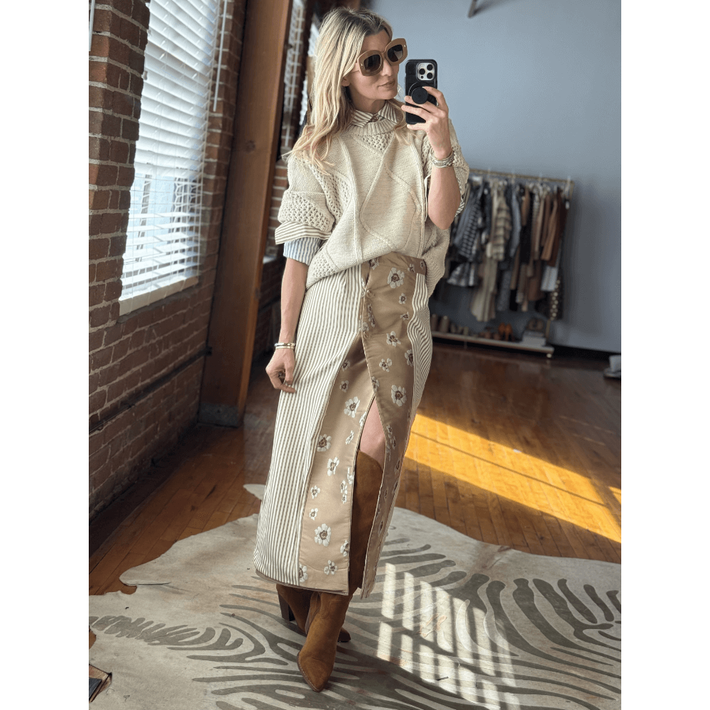 Style the Mel Button Down with the Whitney Wrap Skirt - flipped around to showcase the coordinating lining. A super cute way to create more detail and pattern mix in your look. Pop on the Oatmeal Fisherman Sweater to warm it up!