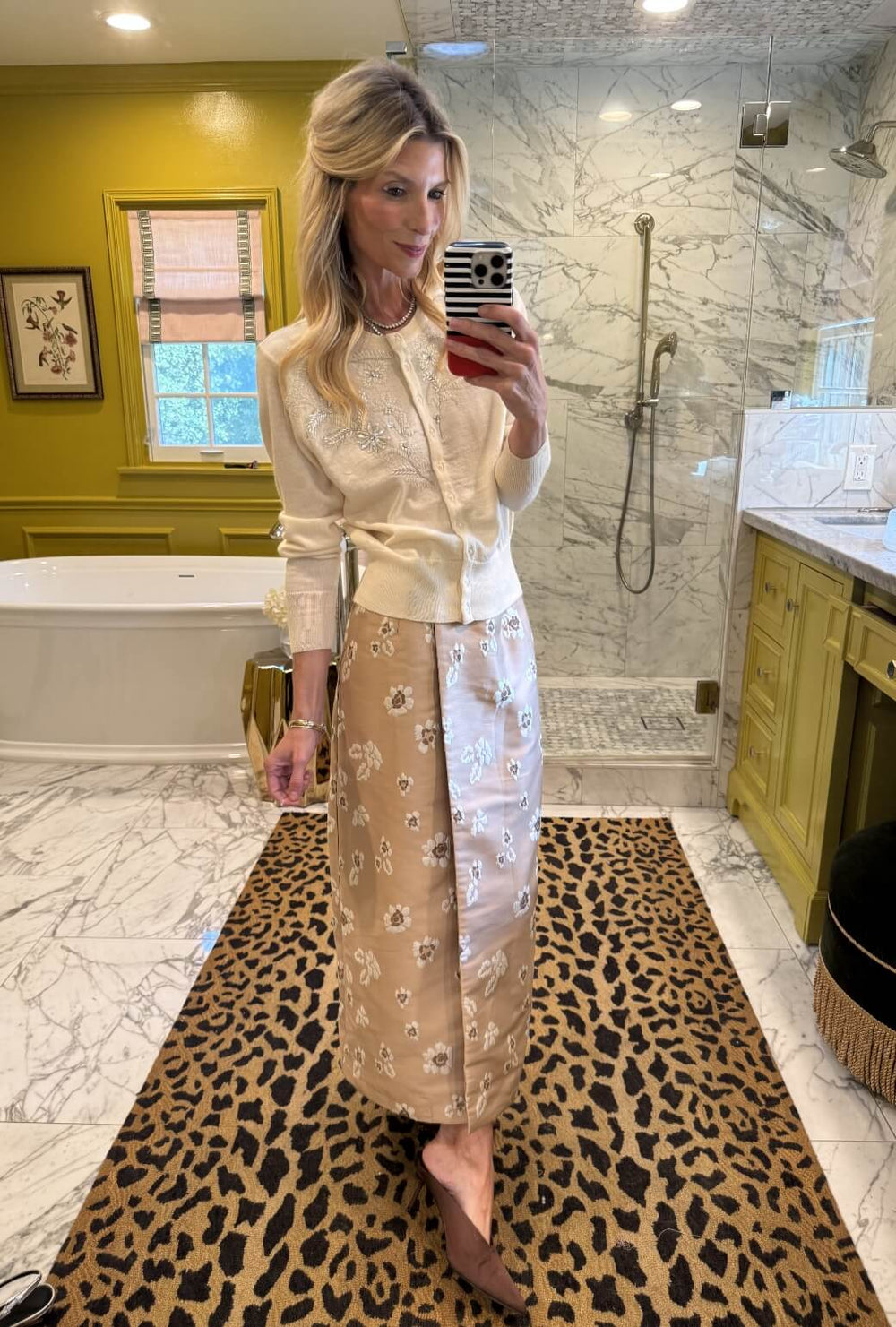 We love this cardi styled for autumn (and we think this look would be a Thanksgiving no brainer). A tonal look with our Whitney Wrap Skirt and finished with brown mules.