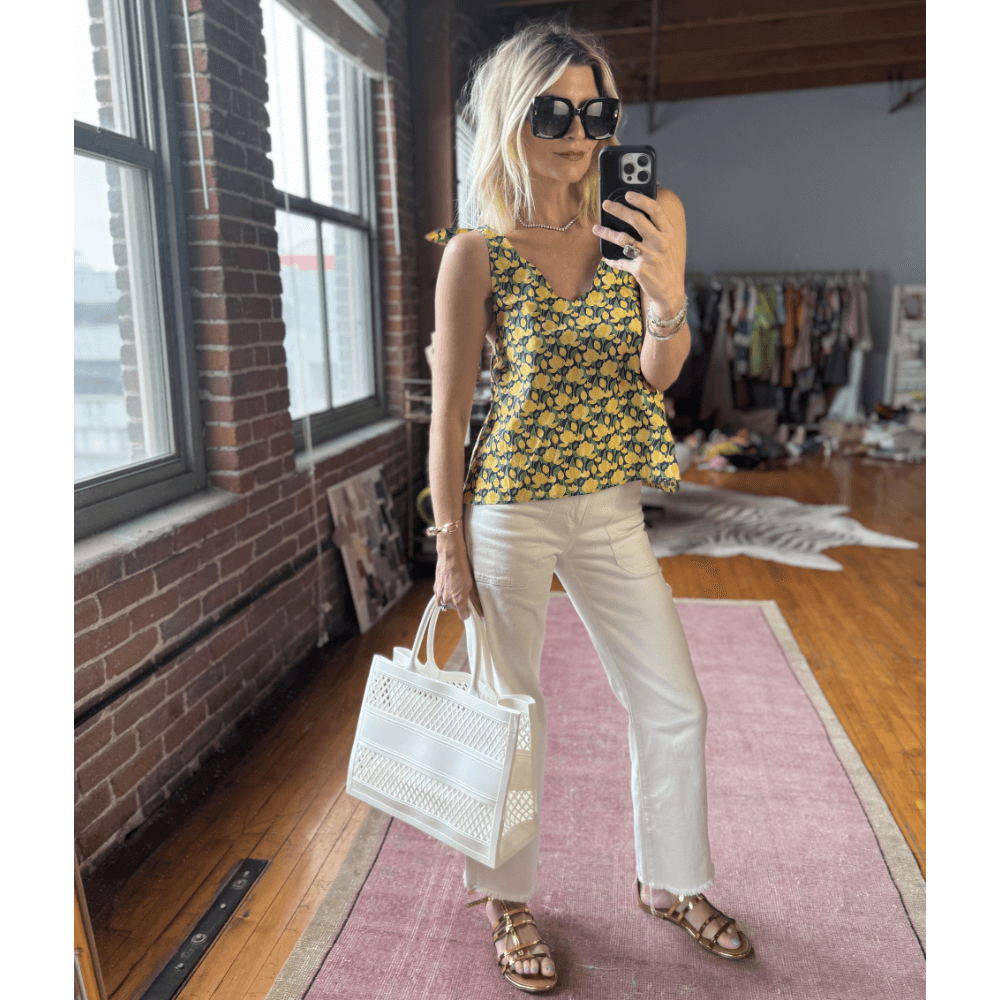 If you prefer to break up the floral print, this is the perfect top to pair with white jeans. An easy silhouette that feels light and airy when paired with a the structure of denim.