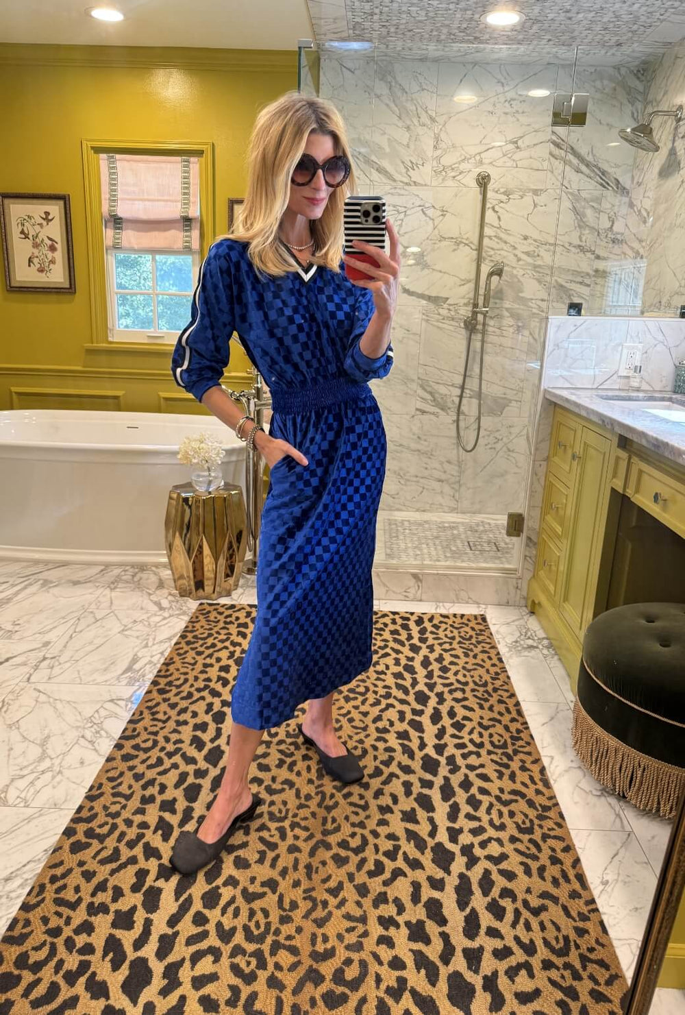 It's hard to put into words just how dreamy this dress is in person. Buttery soft, blue checkerboard velour with a sporty black & white striped elastic band around the neck and down the sleeves, our Track Dress was inspired by the 1980's "activewear". Why wear a track suit when you can wear a track dress, right? Dress her up with heels for a night out or toss on your favorite sneakers and hit the ground running on a busy school day.