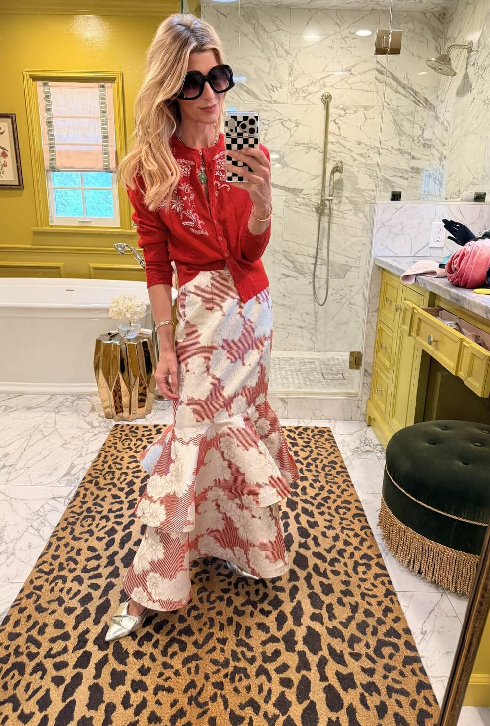 Head to toe in red floral brocade is just right for turning heads on Derby Day and beyond. Finish the look with a metallic shoe to bring out the shine in the brocade.