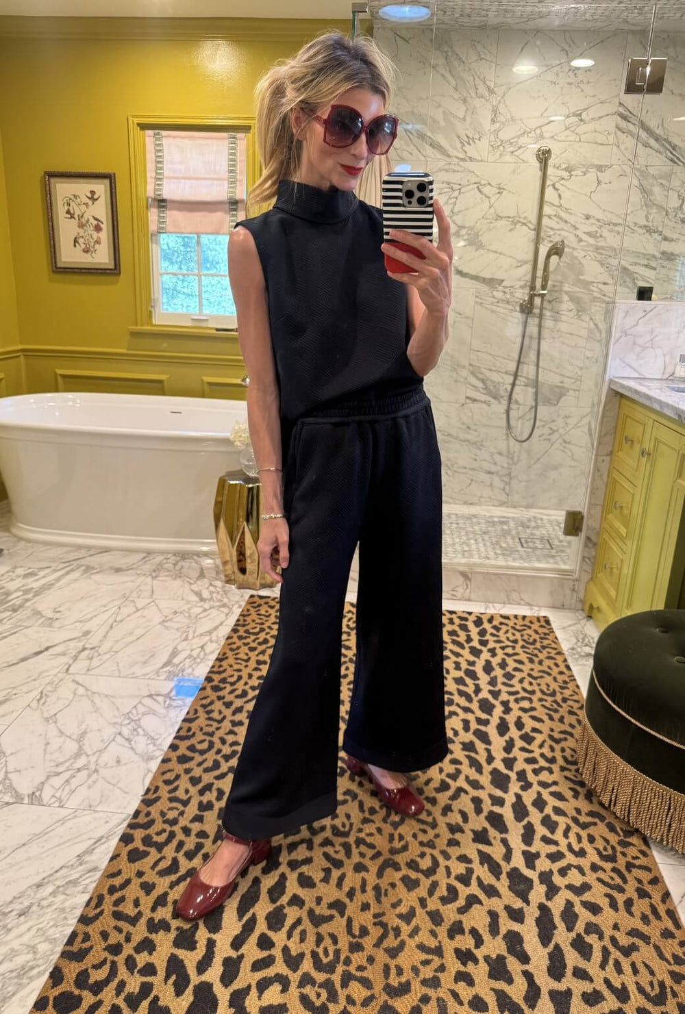 This navy jacquard matching set will be your new fall wardrobe. Style with flats or a sneaker in the day, add a heel for the evening, she's a wardrobe powerhouse.