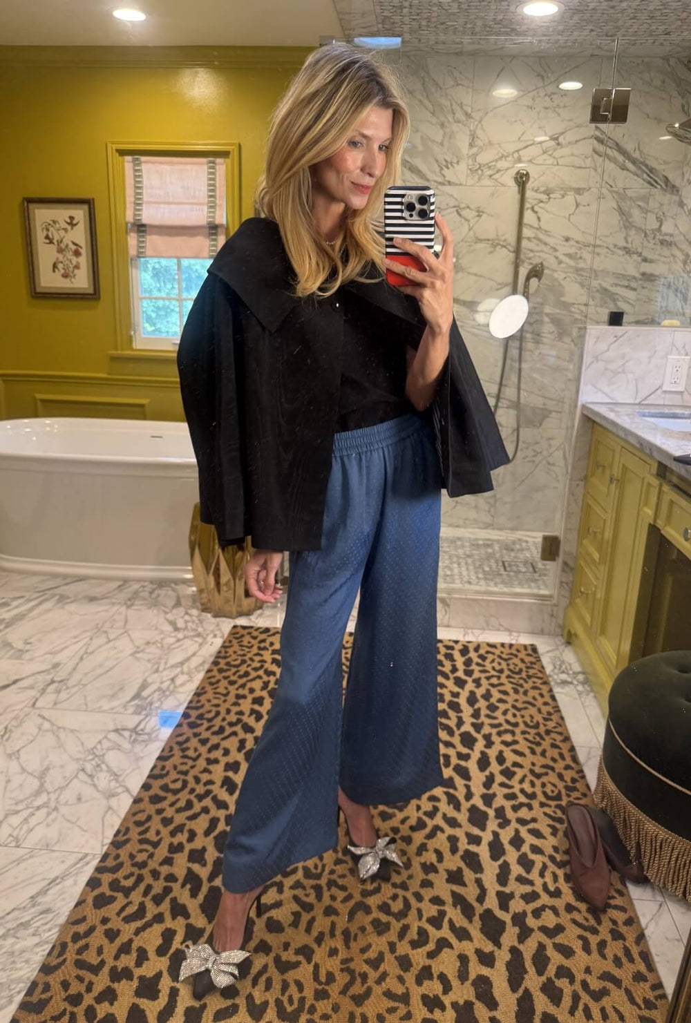 The ultimate pairing. Our cornflower trousers paired with our cropped Grace coat and black top for chilly days and nights.